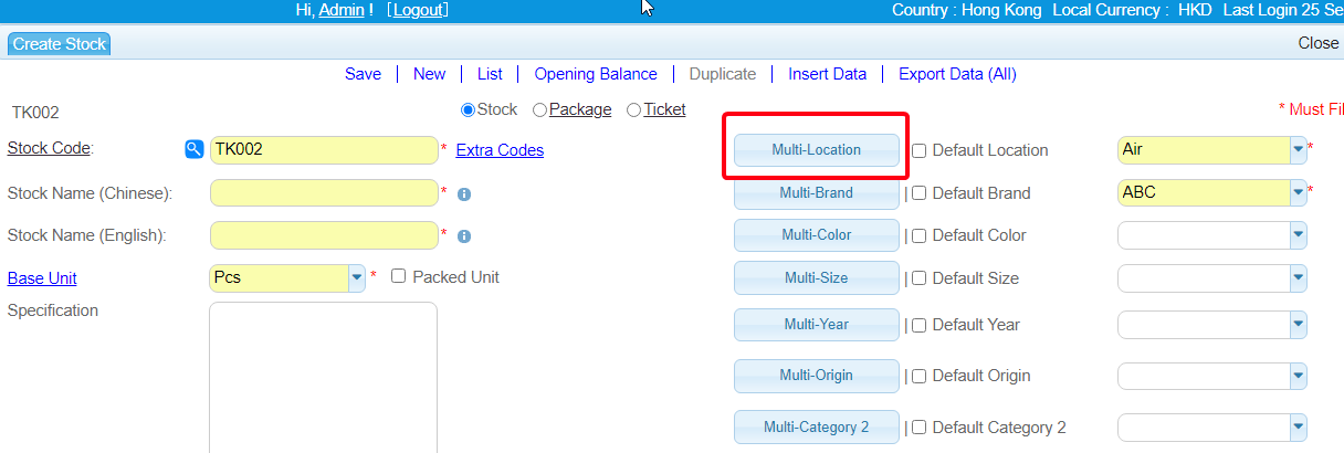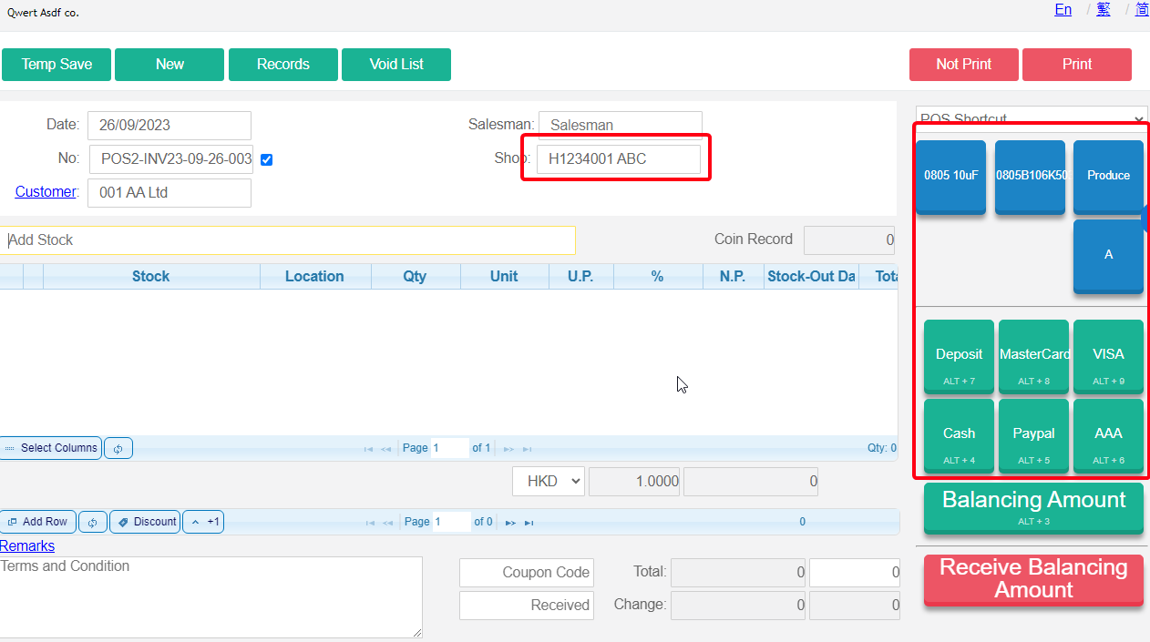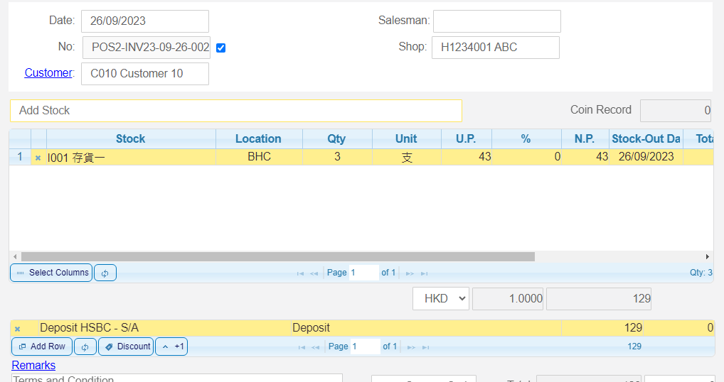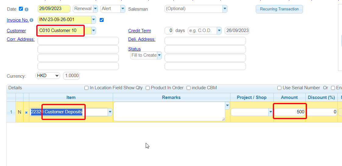 在發票裡,輸入日期,編號和客戶。科目選客戶按金,直接輸入訂金的金額,這張發票只用於要求客戶支付訂金,不輸入任何庫存。