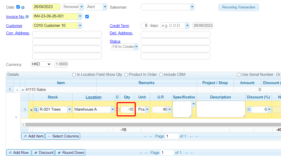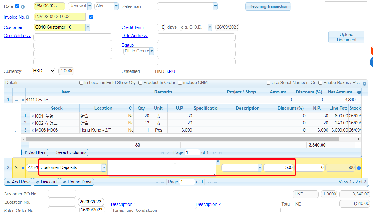在發票扣減按金:除了發票原有資料外,新增一行,科目選客戶按金,金額輸入扣減按金的金額,需要輸入負數以扣減。