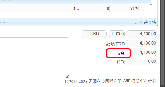 2. 如你的客戶給你按金的時候,是按照特定發票收取並扣減按金,請參考以下步驟:在發票輸入頁面右下角,可以找到按金按鈕。點擊按鈕,即可打開這張發票的按金管理介面: