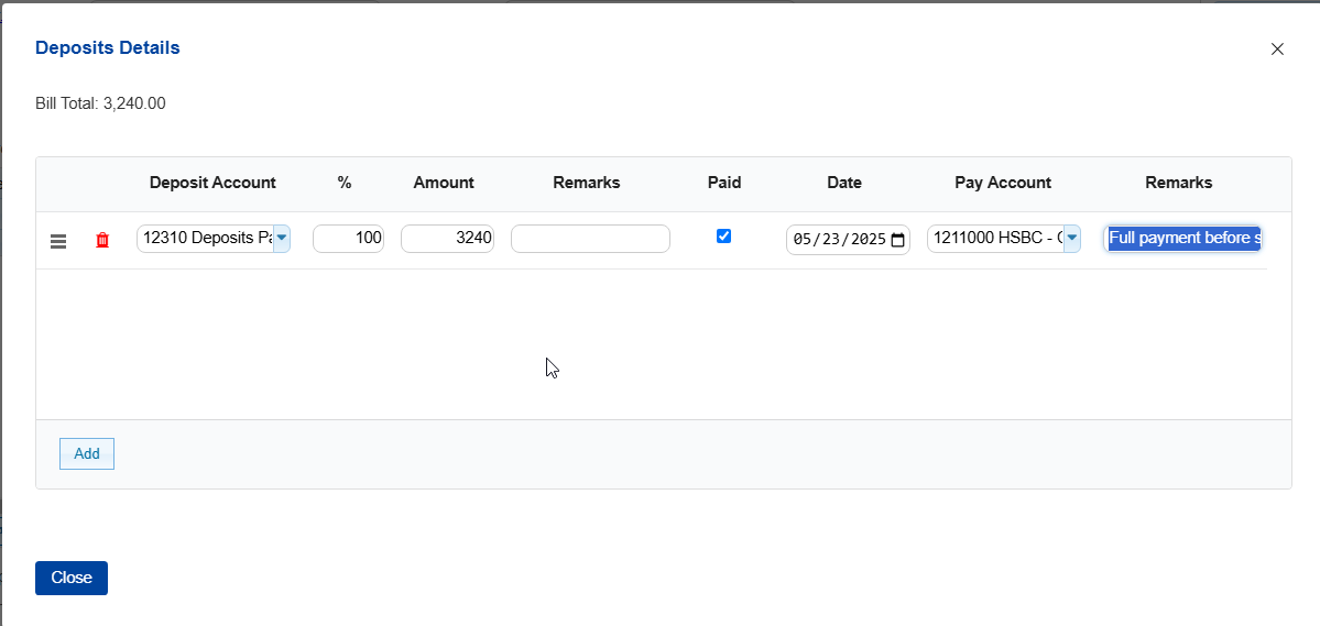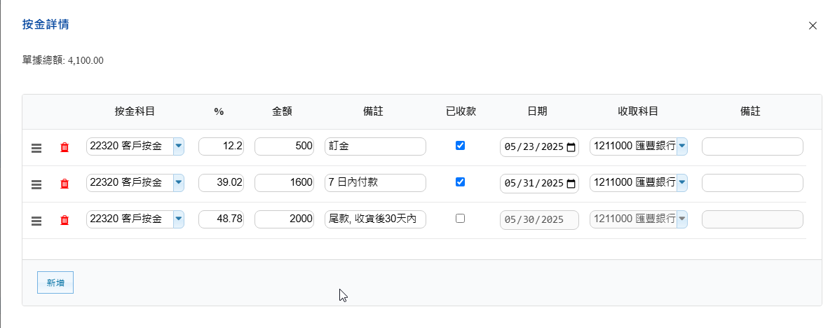 可以逐行輸入多項按金用戶可依據整單的金額輸入相應的百分比,系統將自動計算並填充預付金額;用戶亦可根據實際要求,直接手動輸入確切的預付按金金額。