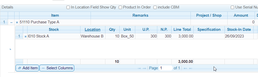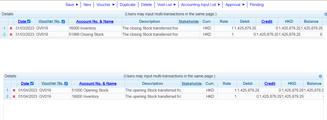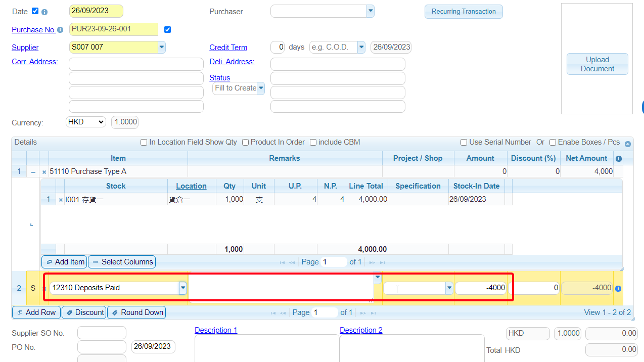採購單收貨,扣減預付按金:新增一行,科目選預付科目, 金額輸入需扣減的金額(負數)