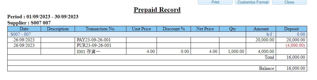 採購分析報表 -> 預付狀態,可以查看預付按金記錄: